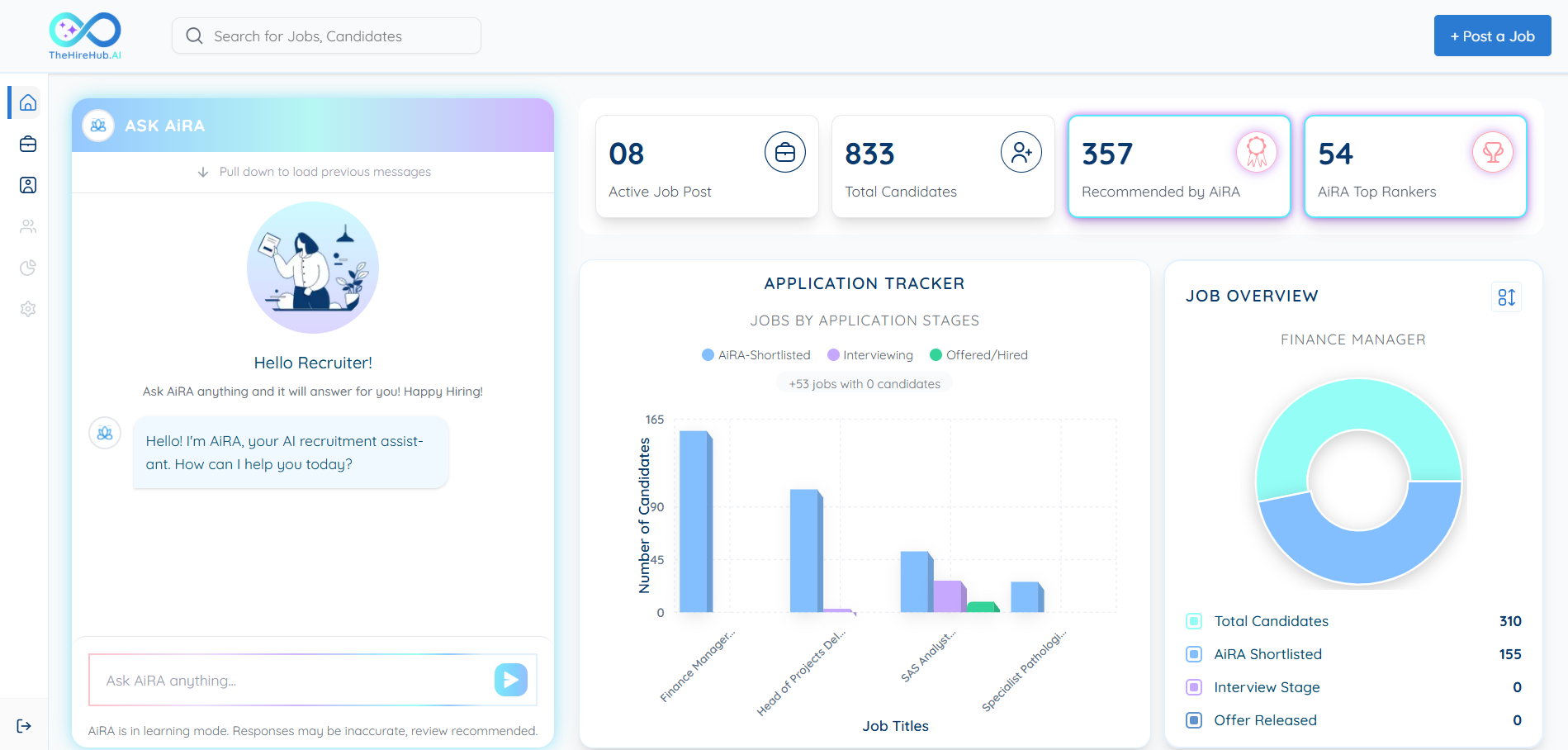 AiRA moves candidates through stages, selects panellists, and schedules—hands-free.
