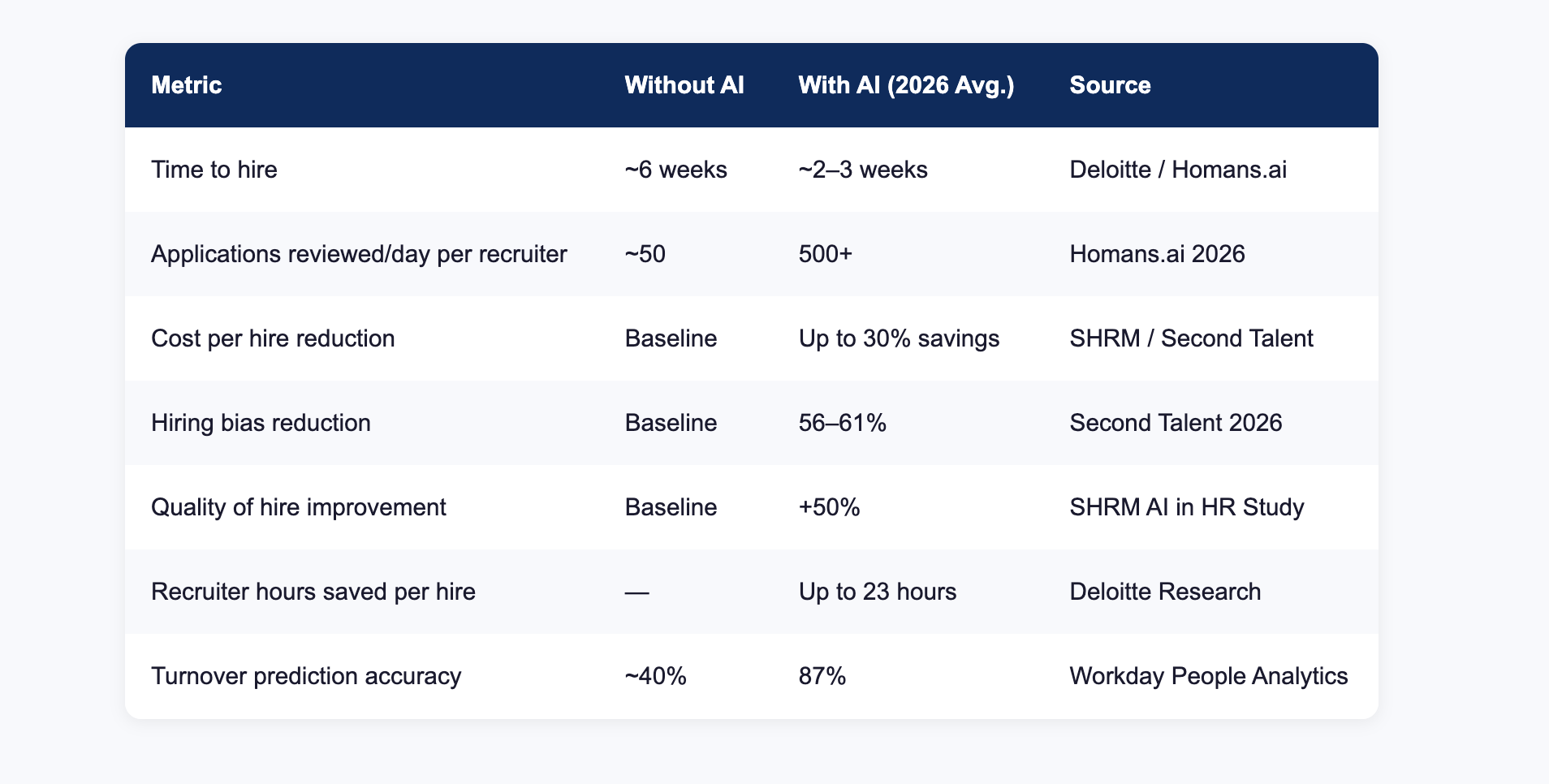 If you're building a business case for AI hiring tools, here are the stats that matter — all from third-party research published in 2025–2026: