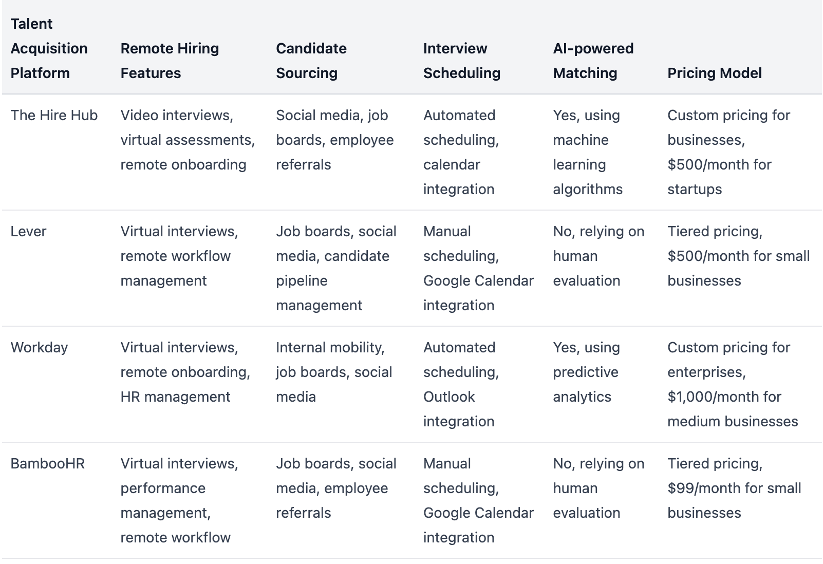 This comparison table provides a clear and concise overview of the key features and attributes of different talent acquisition platforms for remote hiring. The criteria used for comparison include: * Remote hiring features: The types of features each platform offers to support remote hiring, such as video interviews and virtual assessments. * Candidate sourcing: The methods each platform uses to source candidates, such as job boards, social media, and employee referrals. * Interview scheduling: The ways in which each platform handles interview scheduling, including automated scheduling and calendar integration. * AI-powered matching: Whether each platform uses artificial intelligence to match candidates with job openings. * Pricing model: The pricing structure for each platform, including custom pricing, tiered pricing, and monthly subscription fees. By comparing these key features and attributes, readers can make an informed decision about which talent acquisition platform is best for their remote hiring needs.
