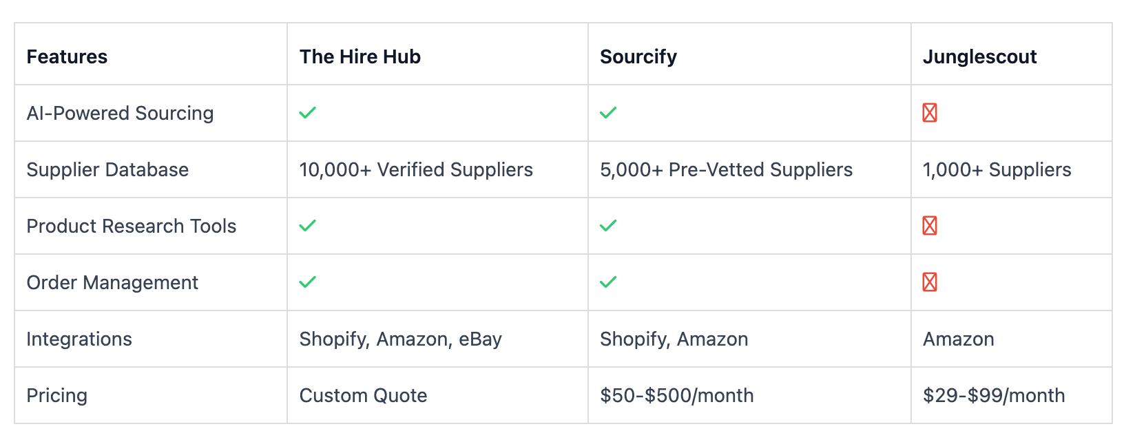 This comparison table highlights the key features to look for in an AI sourcing platform for e-commerce, including AI-powered sourcing, supplier database, product research tools, order management, integrations, and pricing. The table provides a clear and concise comparison of The Hire Hub, Sourcify, and Junglescout, making it easier for readers to make an informed decision when choosing an AI sourcing platform.