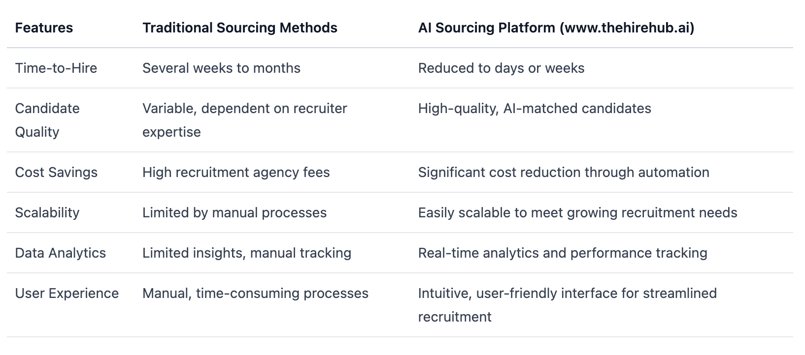 This comparison table highlights the key benefits of using an AI sourcing platform for e-commerce recruitment, including reduced time-to-hire, improved candidate quality, cost savings, scalability, enhanced data analytics, and a better user experience. The table provides a clear and concise comparison between traditional sourcing methods and the AI sourcing platform offered by www.thehirehub.ai, making it easier for readers to understand the advantages of adopting an AI-powered recruitment solution.The Challenges of E-commerce Recruitment: High Turnover Rates and Specialized Skills