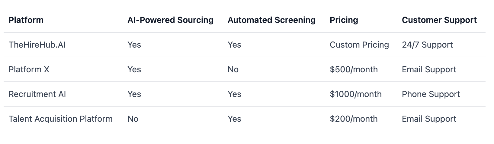 As you can see, TheHireHub.AI stands out from the competition with its comprehensive AI-powered sourcing and automated screening capabilities, as well as its 24/7 customer support. While its pricing is custom and may vary depending on your business needs, it's clear that the platform is designed to provide a high level of service and support.