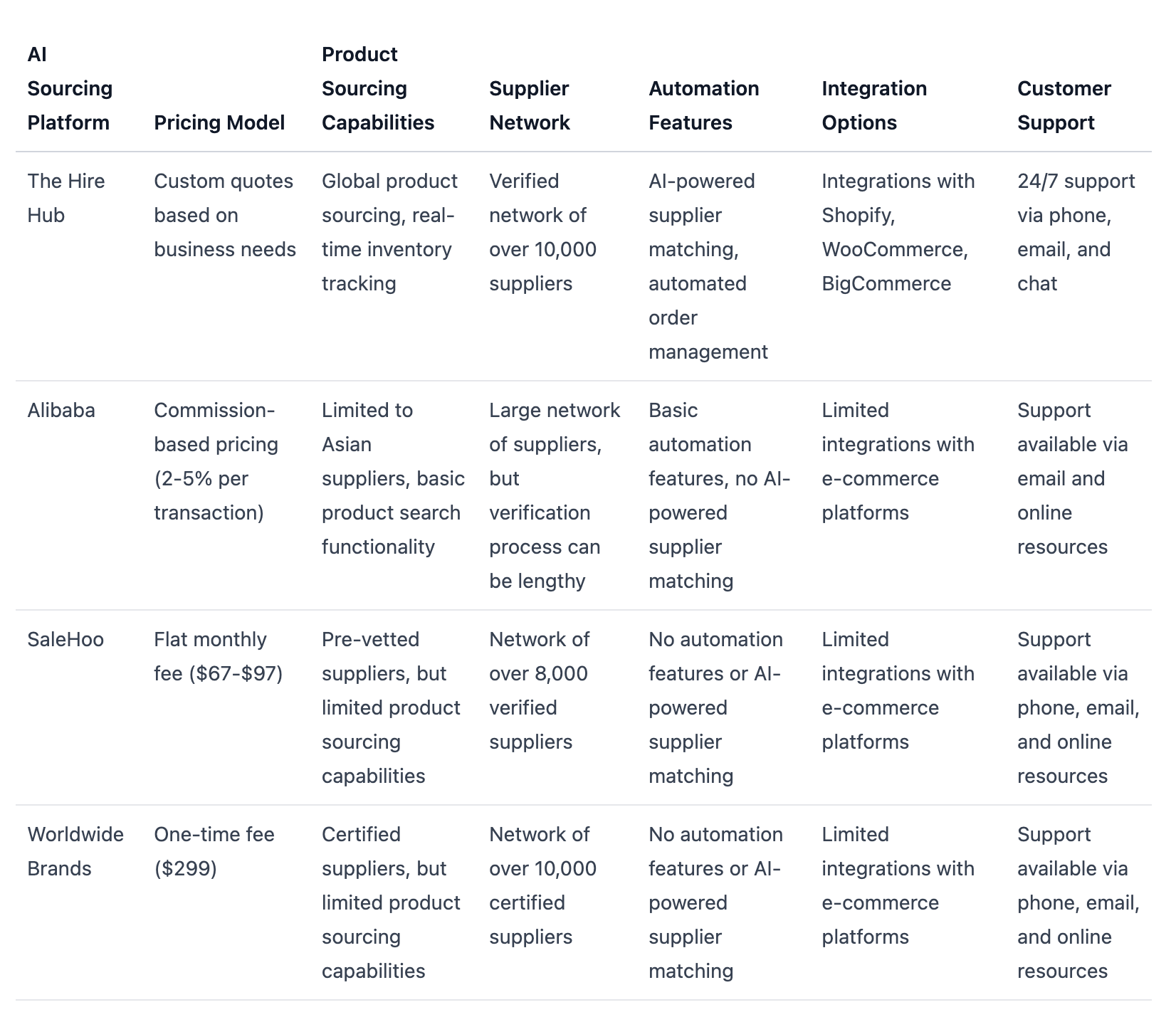 This comparison table provides a clear and concise overview of the key features and differences between various AI sourcing platforms for e-commerce. The criteria used for comparison include pricing model, product sourcing capabilities, supplier network, automation features, integration options, and customer support. This information is relevant and useful for readers who are searching for an AI sourcing platform to meet their e-commerce needs. The table is easy to scan and understand, making it a valuable resource for those looking to make an informed decision.